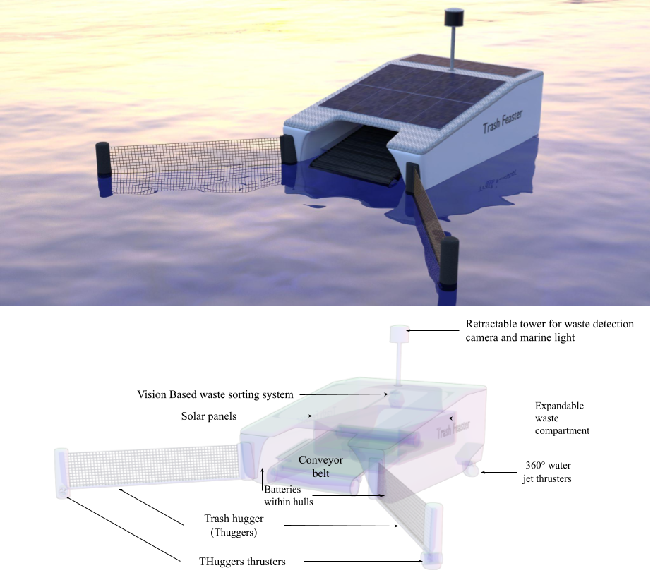 Planned autonomous catamaran-hull vessels with dual rotating jet thrusters, integrated waste collection systems, and Return-to-Base functionality. Design concepts include stability features, solar charging capabilities, and automated docking mechanisms.